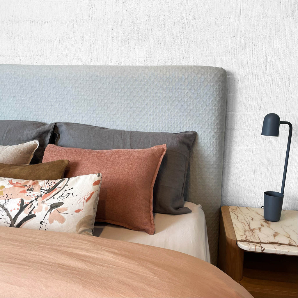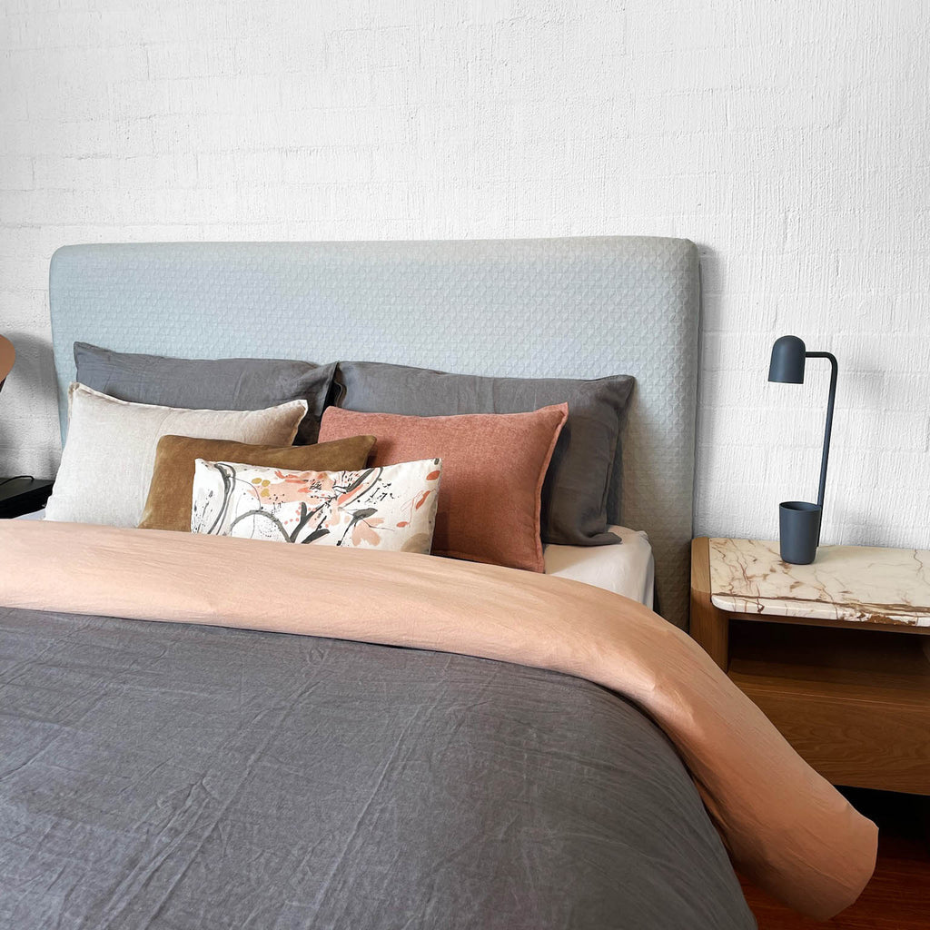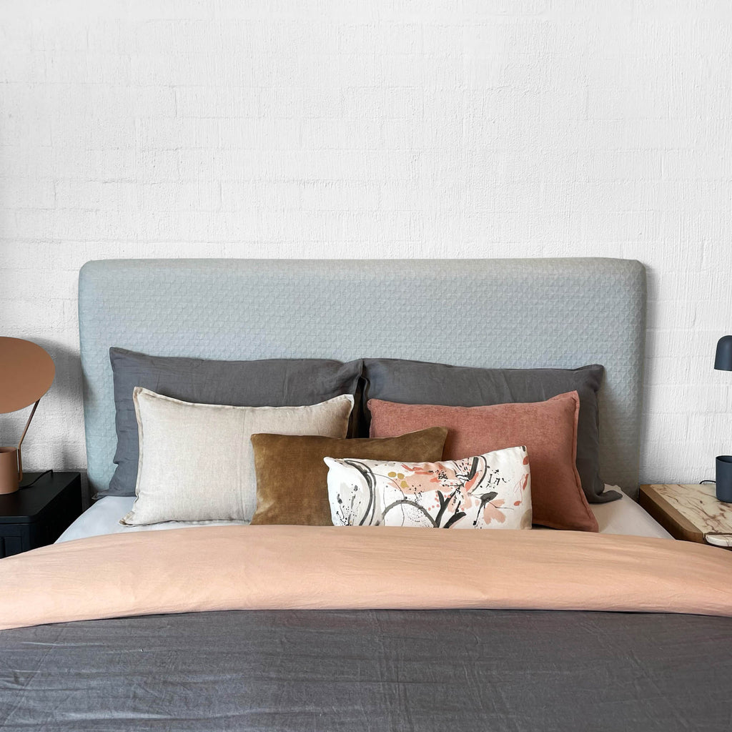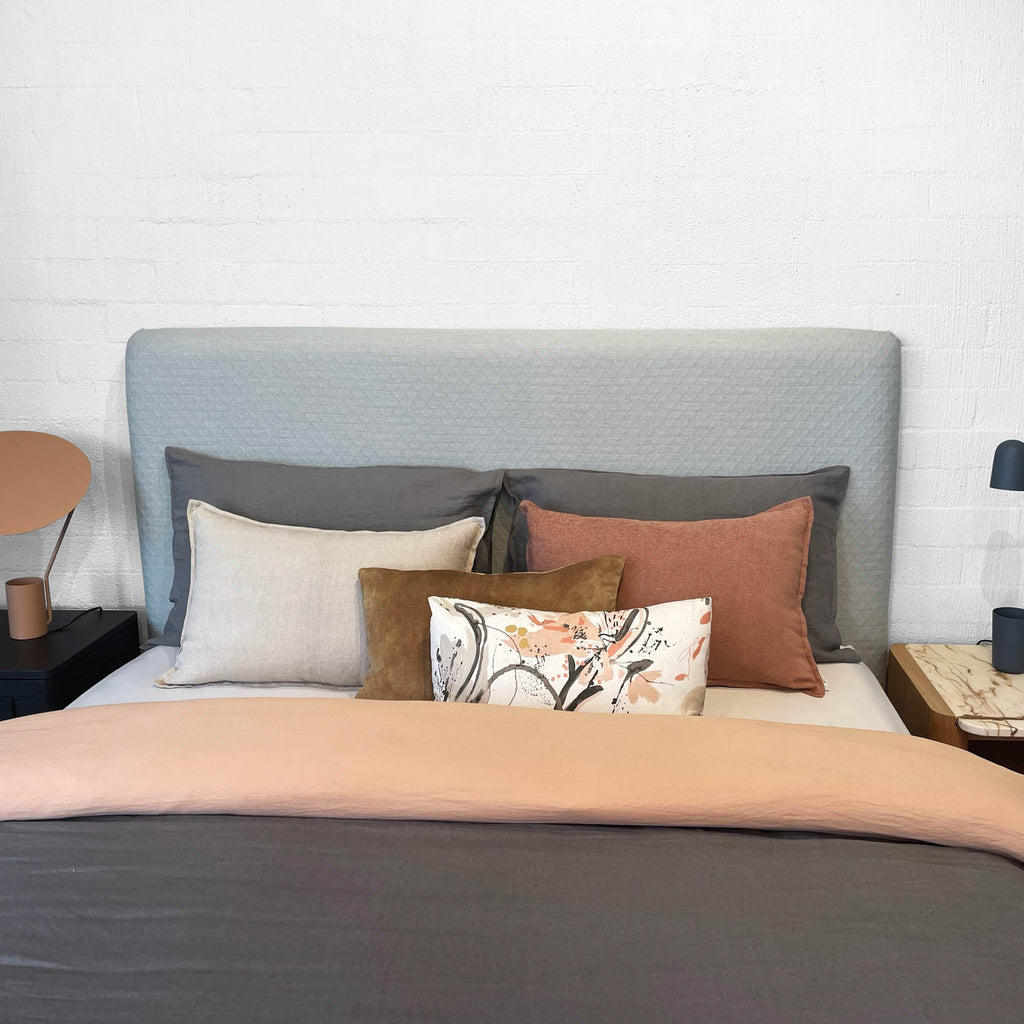 The Darcie Bedhead is an ode to simplicity. This minimalist and streamlined bedhead is the most pared back in our collection. It allows you to continue the minimalist theme and apply a fabric that is all about texture and understatement or pivot and showcase that dramatic large scale print that requires the canvas size structure of Darcie. The Darcie Bedhead adapts with ease to all fabric applications.