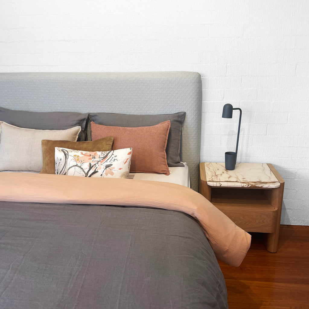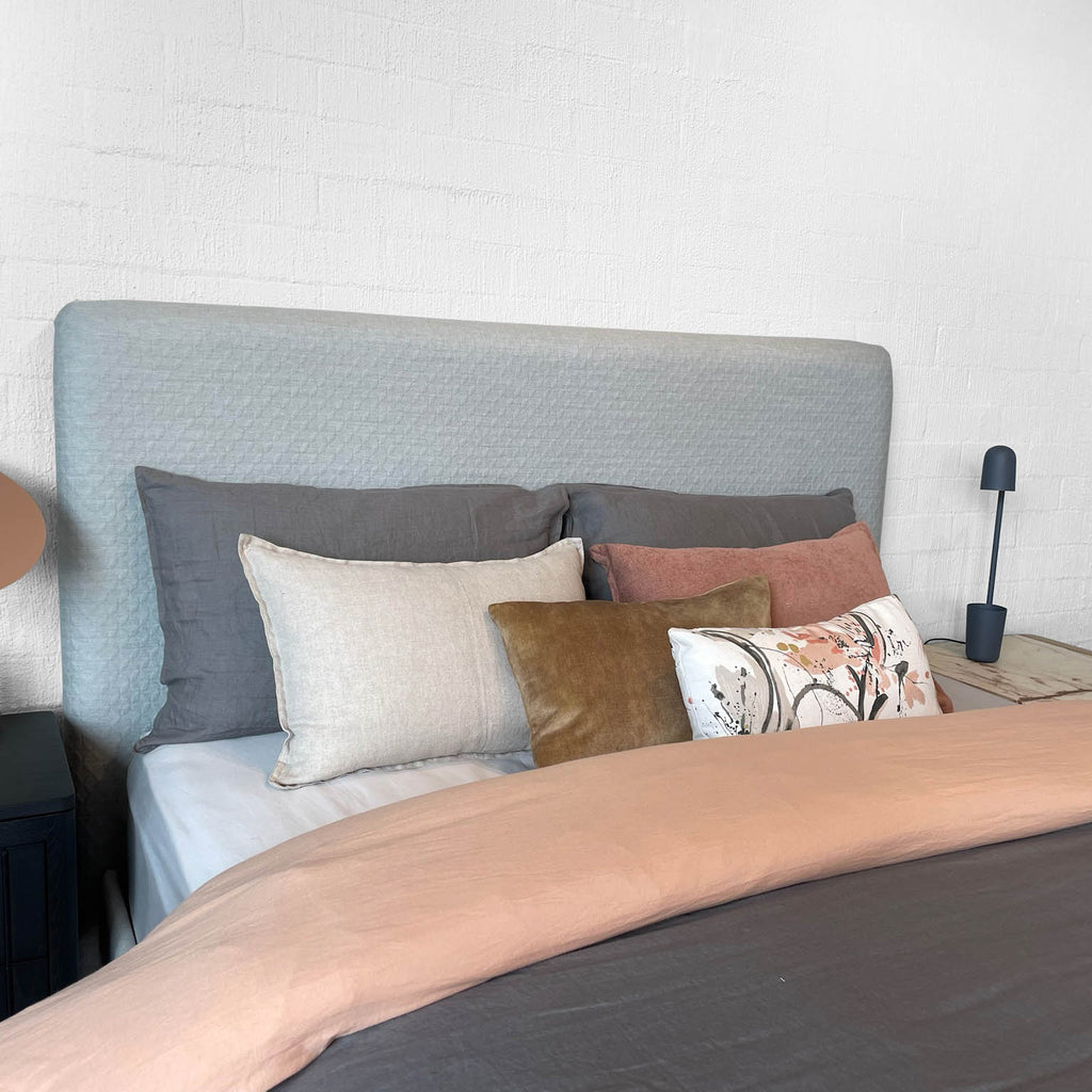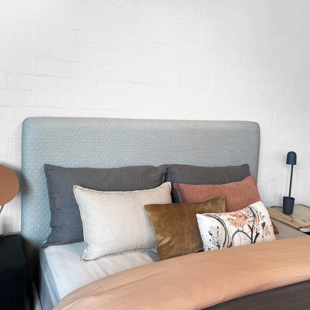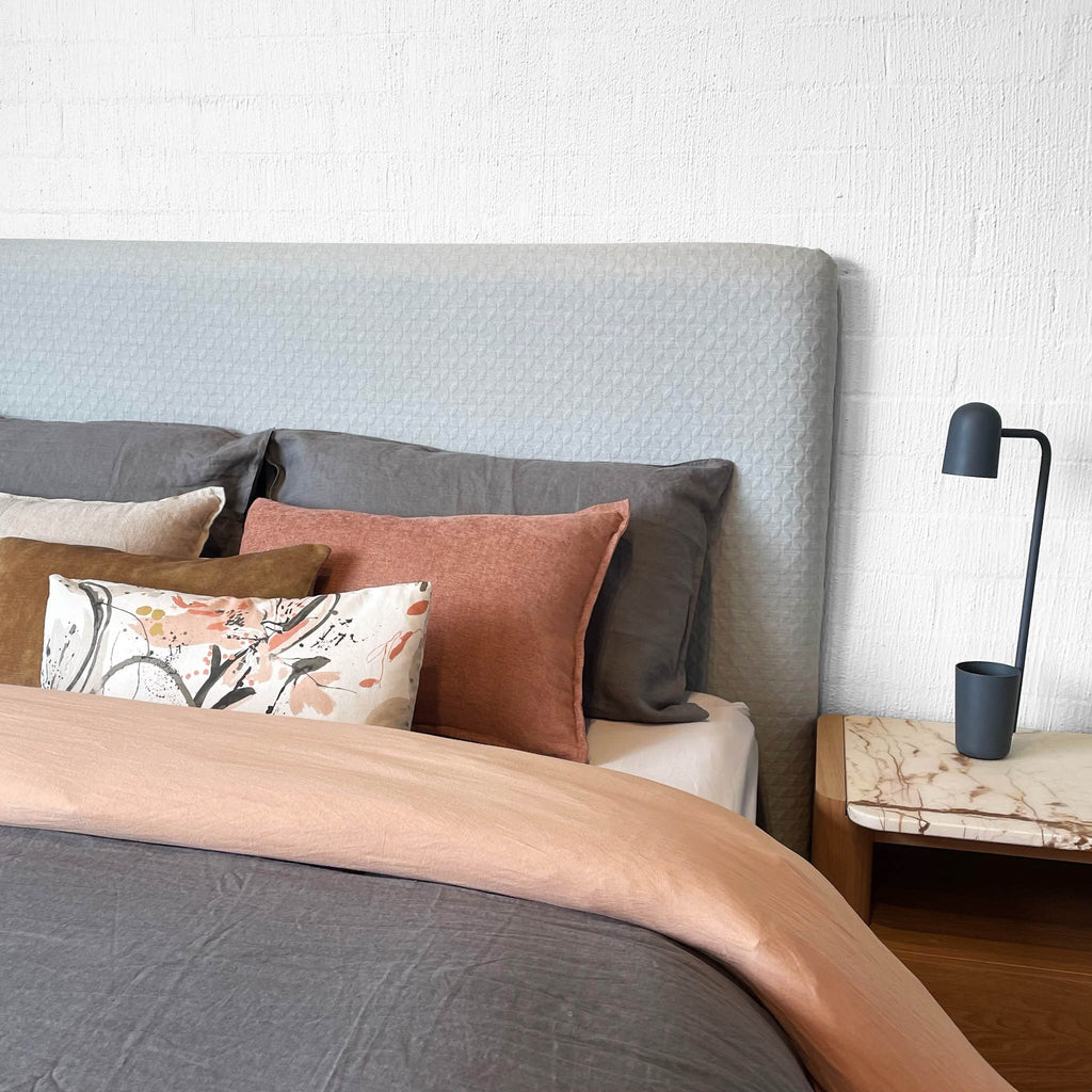 The Darcie Bedhead is an ode to simplicity. This minimalist and streamlined bedhead is the most pared back in our collection. It allows you to continue the minimalist theme and apply a fabric that is all about texture and understatement or pivot and showcase that dramatic large scale print that requires the canvas size structure of Darcie. The Darcie Bedhead adapts with ease to all fabric applications.