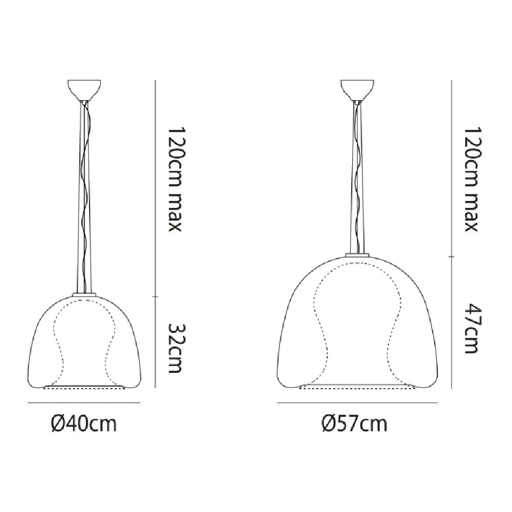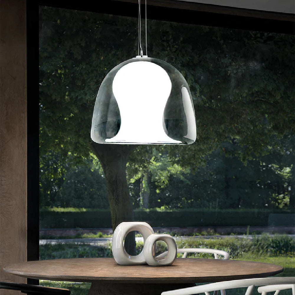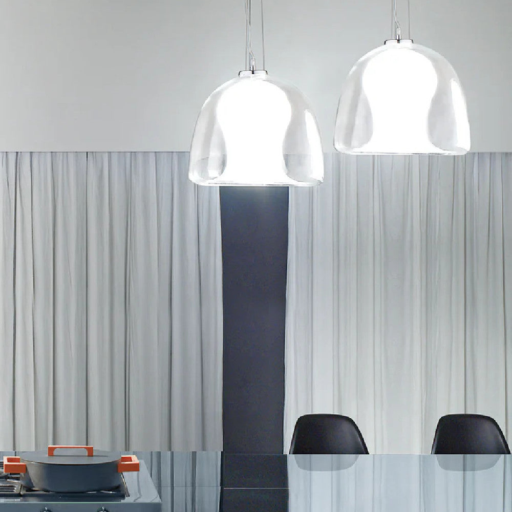The Naranza Pendant by Vistosi is a truly impressive focal piece. Naranza's unique shape which is inspired by the jellyfish is made of two glass components that require state of the art glass blowing and cutting techniques. The Naranza comes in two sizes with a white interior diffuser within transparent crystal.