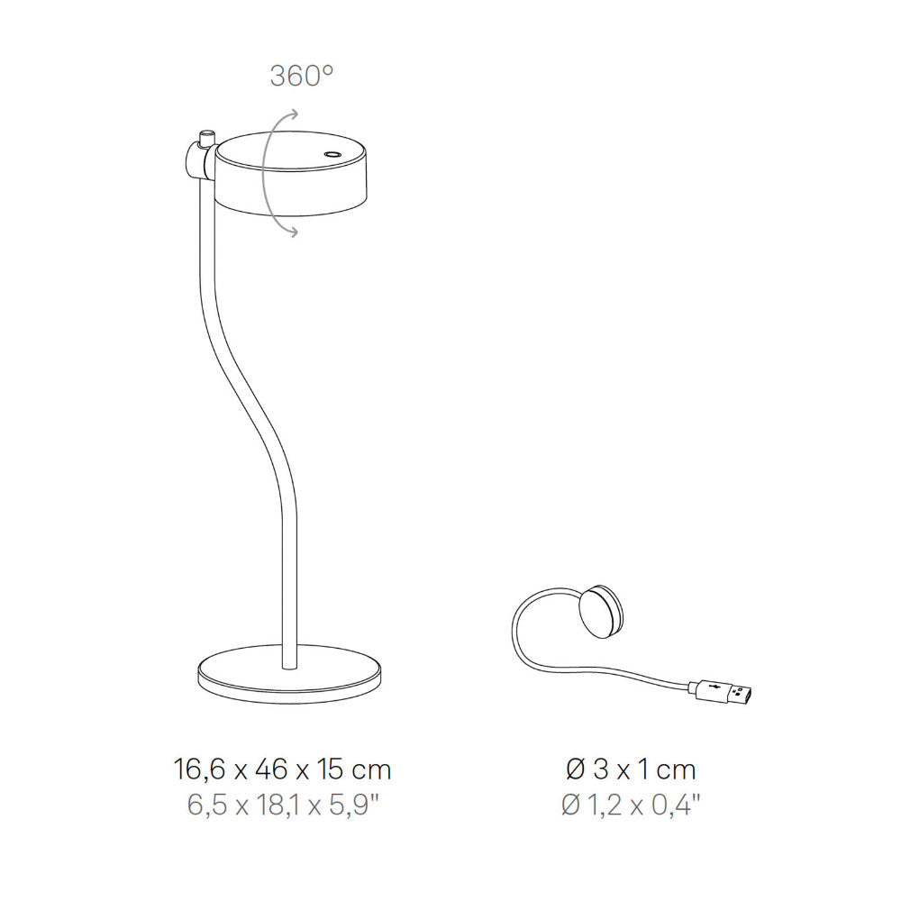 Super O Table Lamp by Zafferano is cordless and rechargeable with a LED module that is attached to the lamp frame with a magnet. It can rotate 360°, allowing you to aim the light flow. Its touch control allows you to adjust brightness with 4-step dimming and select from colour temperatures of 2700K, 3150K, and 4000K. With a high IP65 rating, Super O is also suitable for outdoor use. An electronic control system monitors the remaining battery power and guarantees a constant luminous flux until the battery runs out, ensuring that recharging is optimised and always performed correctly. The module can be removed and recharged easily by connecting it to the contact charging disc. Battery charger not included.