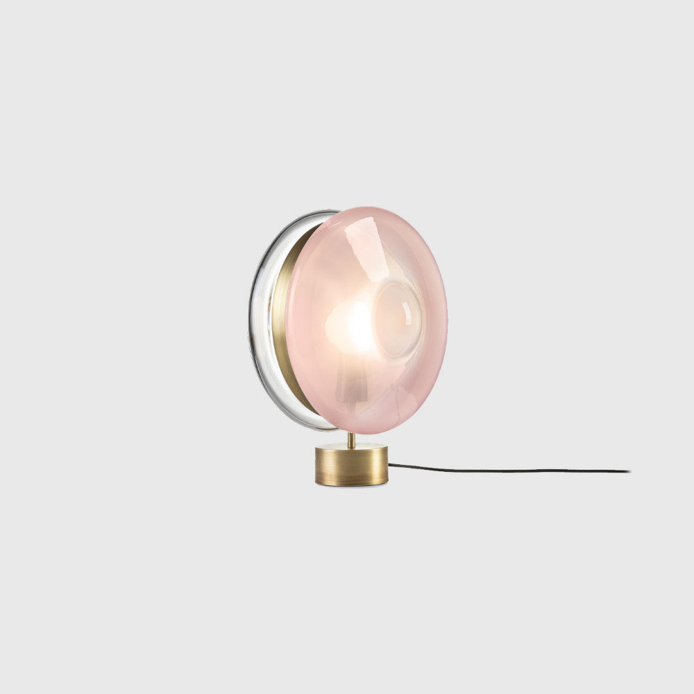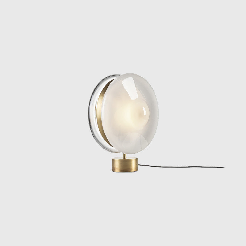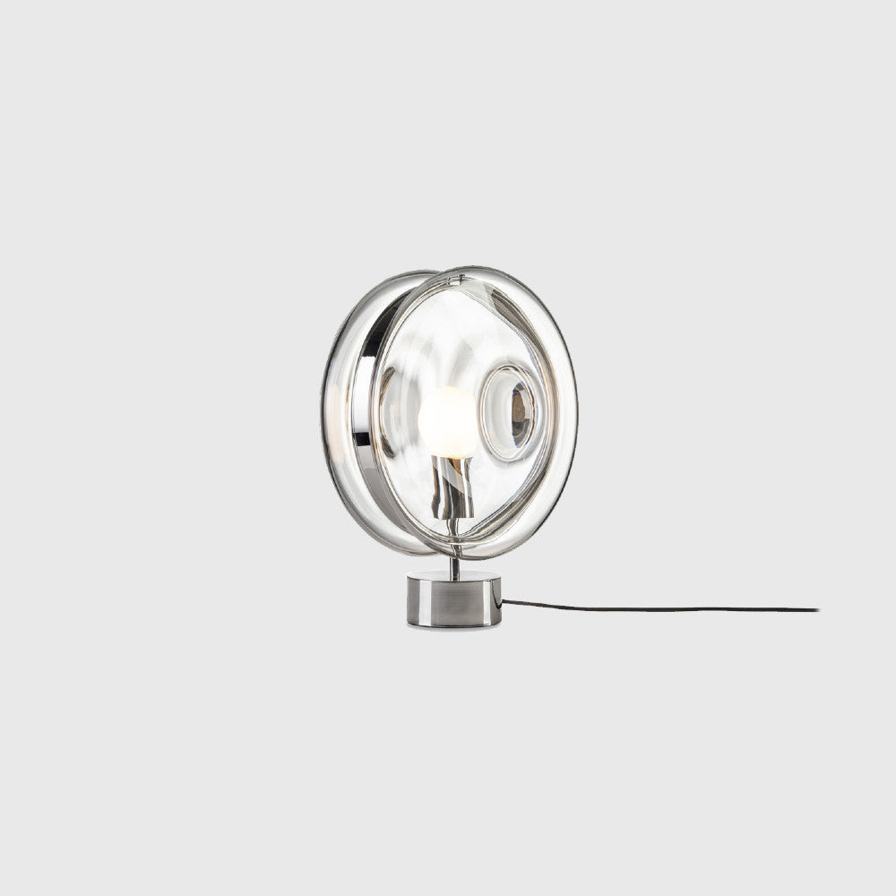 Orbital Table Lamp by BOMMA is part of a collection inspired by the orbital paths of multi-coloured celes¬tial bodies with hypnotically glowing cores. This ingenious design of hand-blown glass lenses, held together by a metal mounting, creates a fascinating visual experience from different angles. Orbital Table Lamp is available with a Silver or Patina Gold structure finish and four glass finish options.