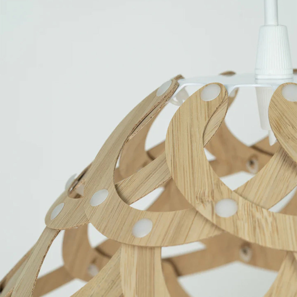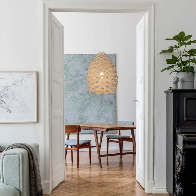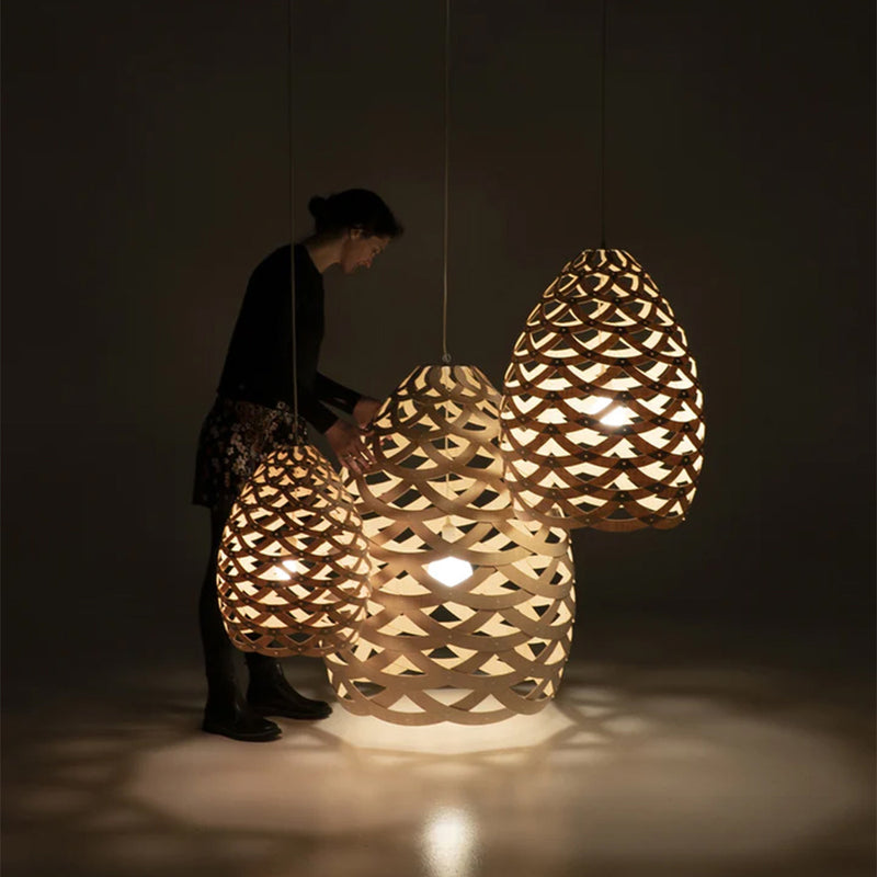 Tui by David Trubridge is named after the native Aotearoan bird which inspires it's design. Just like the intricate plumage found around the birds' neck, bamboo half-rings are woven into a basket form. Tui would sit perfectly over a dining table, kitchen counter or equally hanging in a stairwell or entrance. Available in the full range of Trubridge finishes in small, medium, and large size.