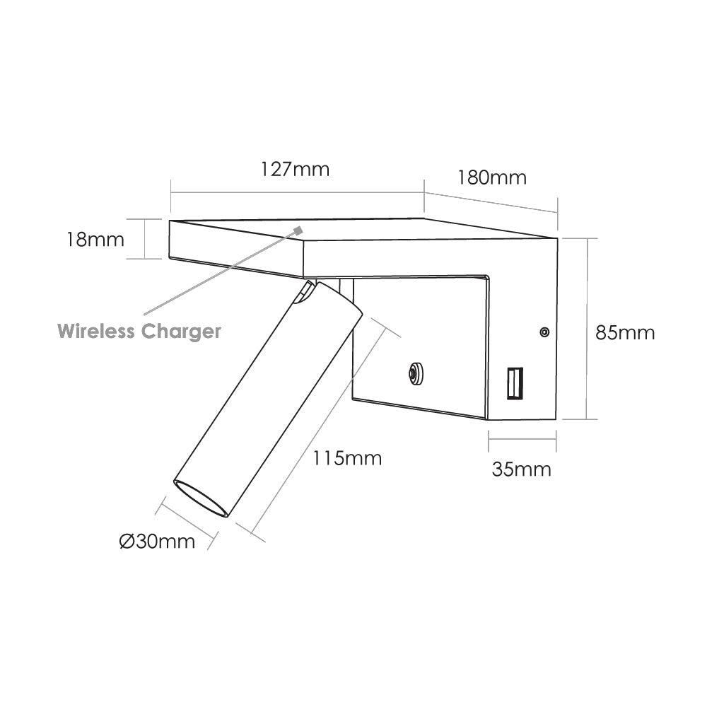 The Hilton shelf light with wireless charger and USB is ideally suited as a bedside reading light. Equipped with an adjustable 5W LED spot light with a 3-step dimmer switch on the base. The top surface provides wireless charging on contact, with USB charging available via the port located on it's side. Available in sandy black or sandy white finish.