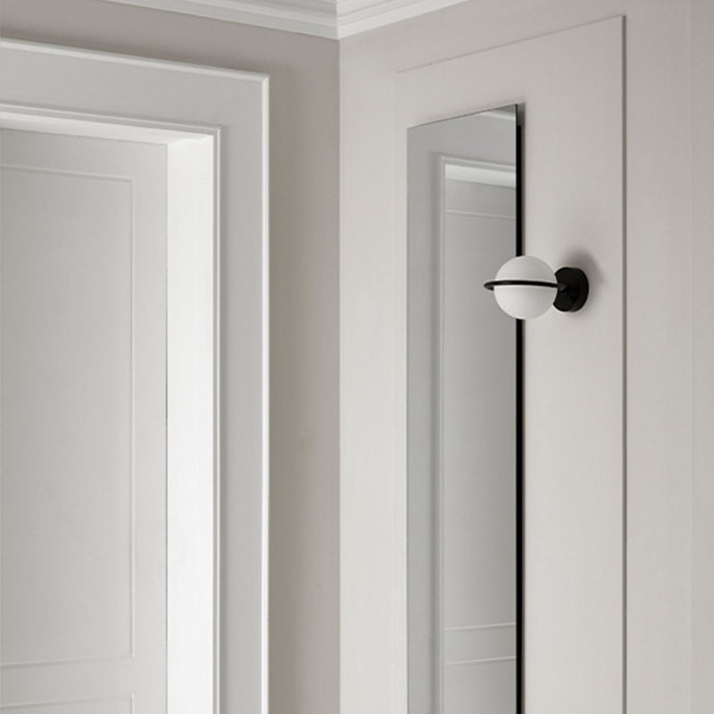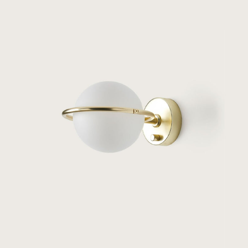 Abbacus Wall Light designed by Pepe Fornas for Aromas Del Campo is distinctly spherical in design. Prominent curvature is seen throughout, lending itself to a simultaneously vintage yet contemporary aesthetic. The sculptural and rounded motif that surrounds the shade is reminiscent of a halo, providing elegant and celestial elements to this stunning wall light.