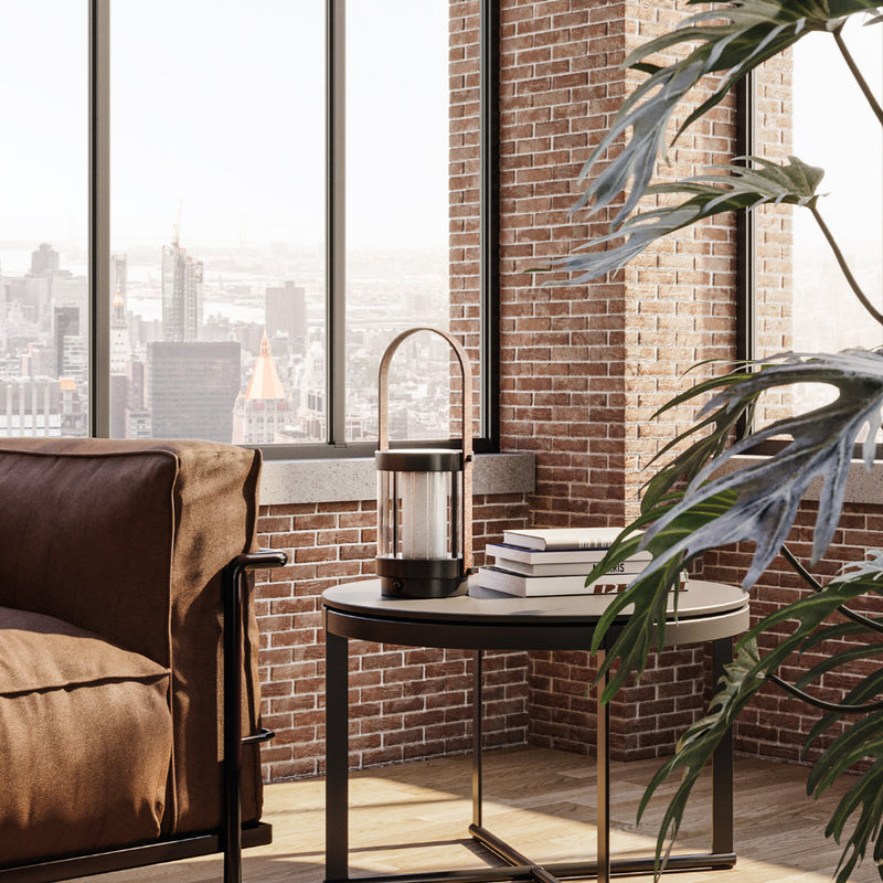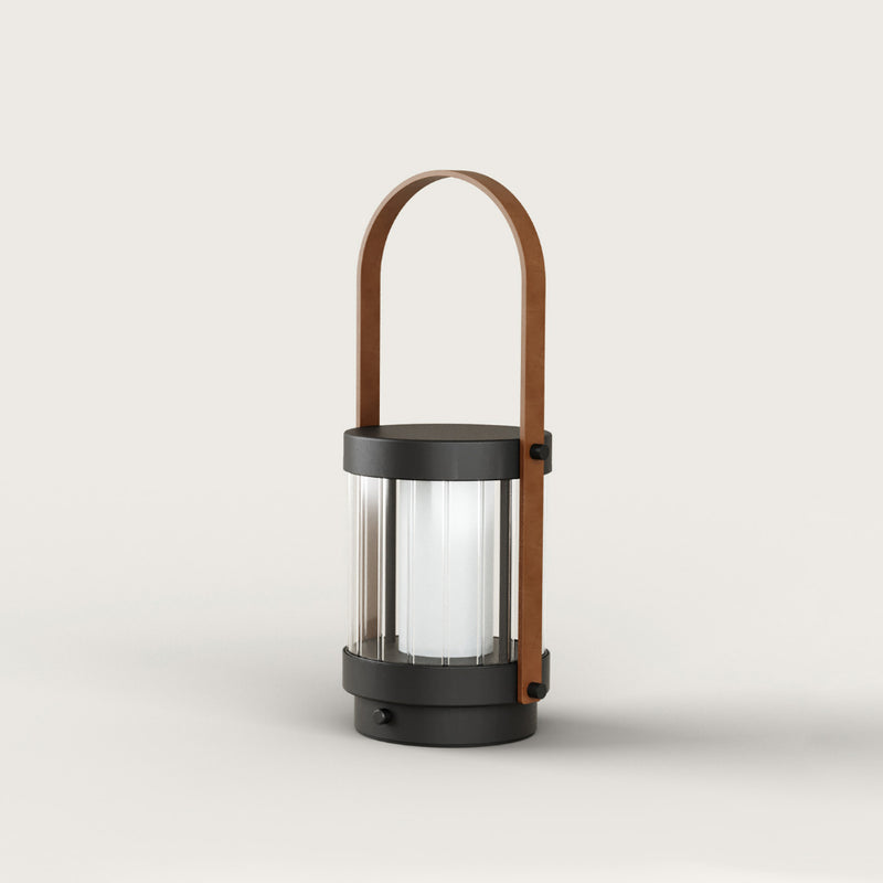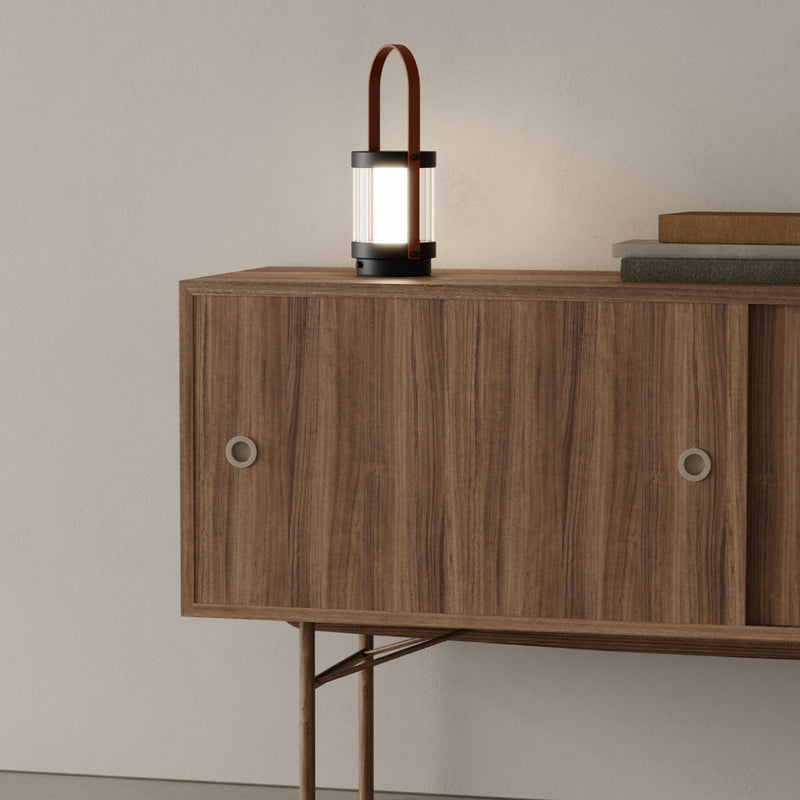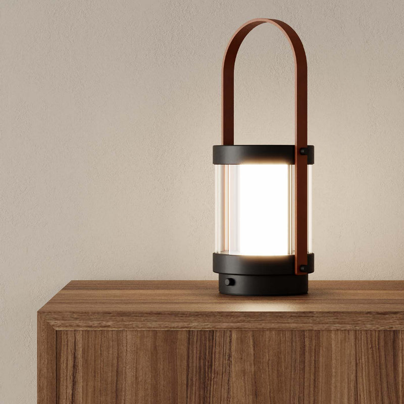 Bally Table Lamp by Aromas Del Campo displays a very modern take on a traditional hand held lantern. Featuring a brown synthetic leather handle that arches over a Matte Black base, the lamp element is housed within the feature curly transparent glass. A portable and rechargeable lamp with touch-dimmable functionality, it has the versatility to sit equally in both a contemporary and traditional space.