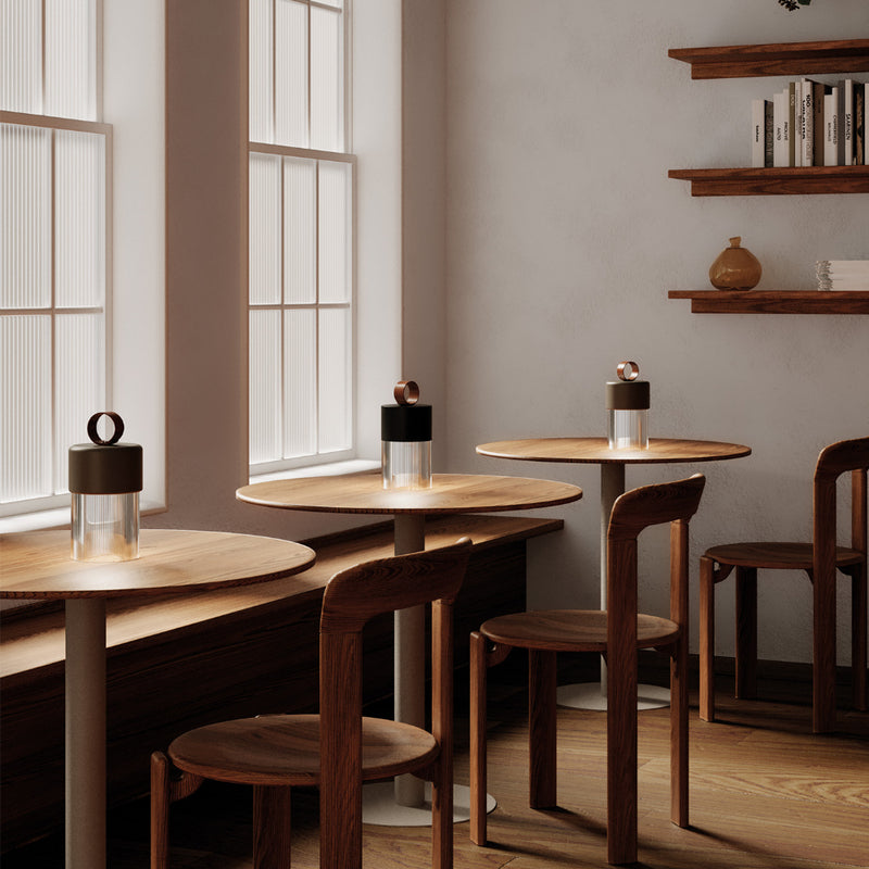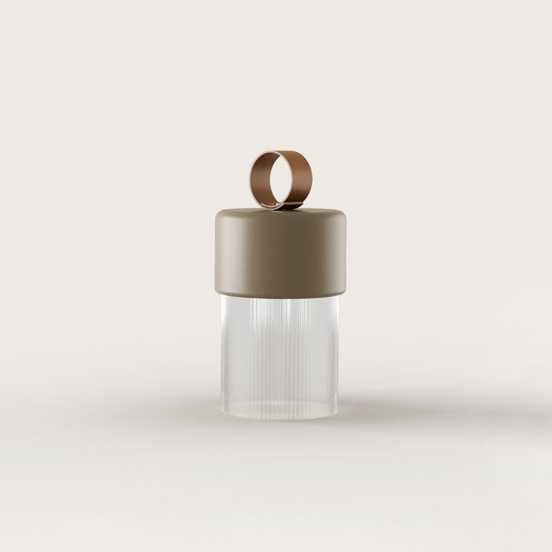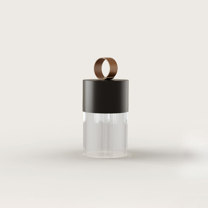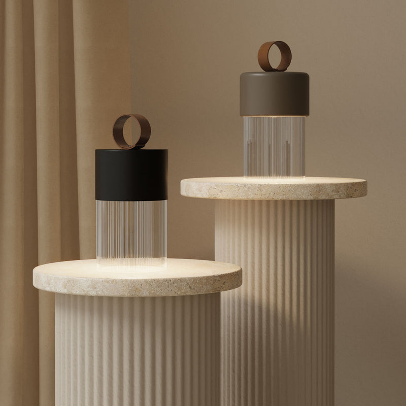 Bora Table Lamp by Aromas Del Campo is a functional and stylish portable light. It features a ridged glass shade from which the lamp emits a soft light and is combined with a steel top and synthetic leather loop for ease of use. This contemporary rechargeable lamp with touch dimmable functionality has the versatility to sit comfortably in any space.