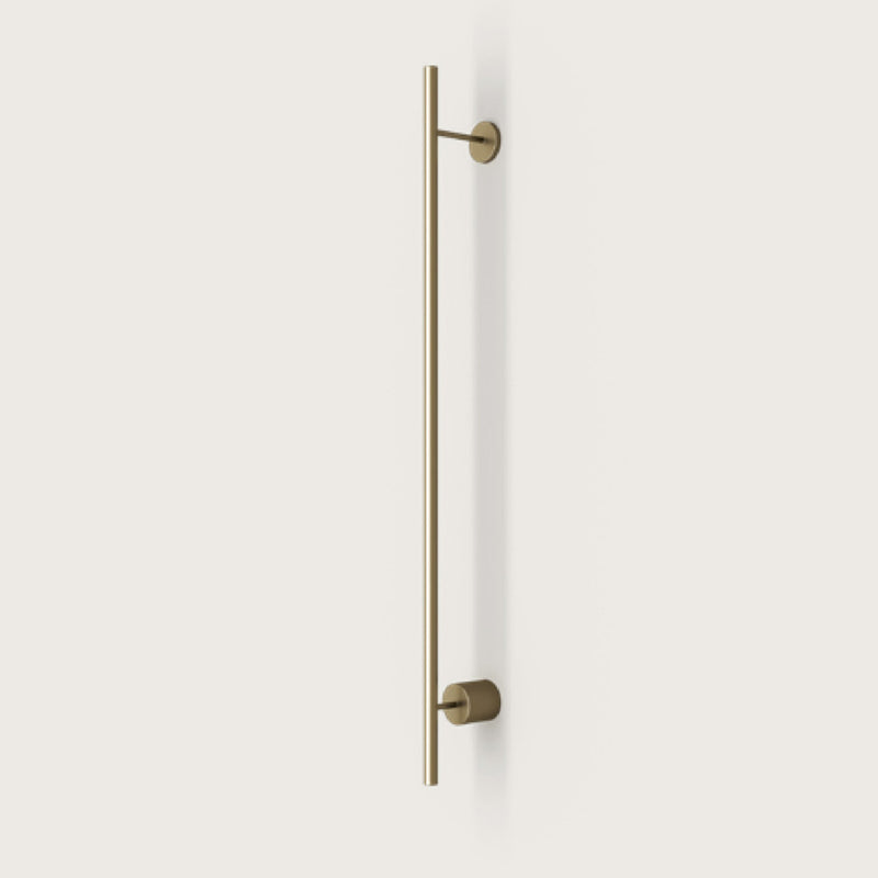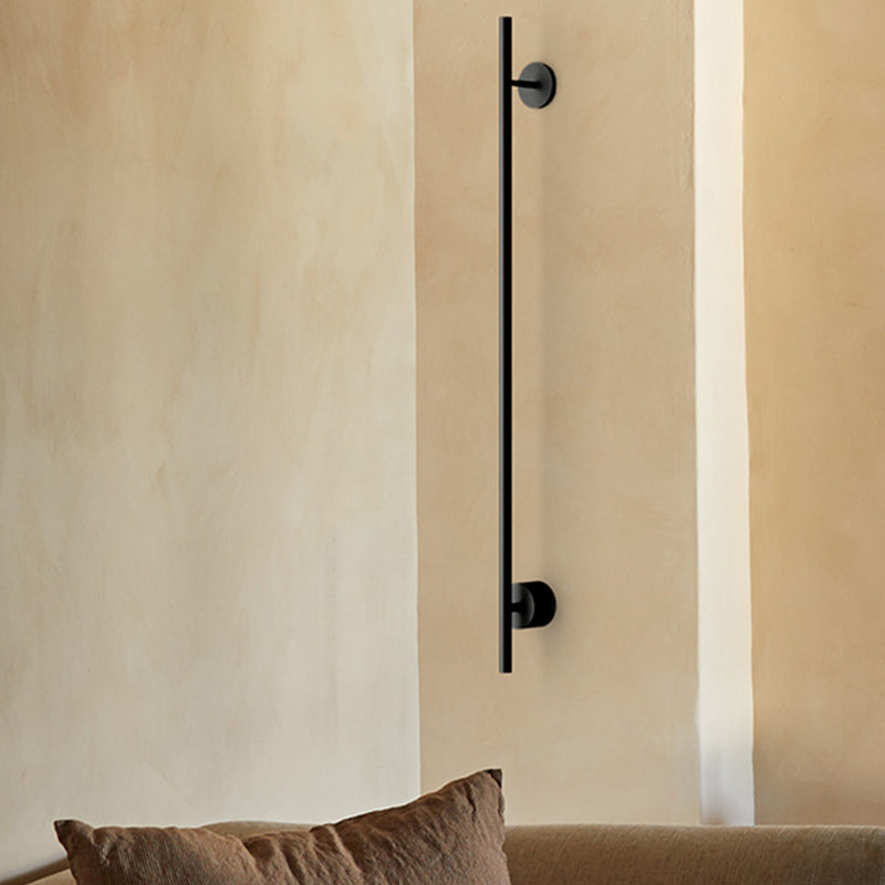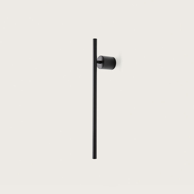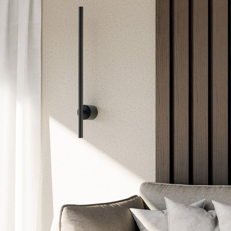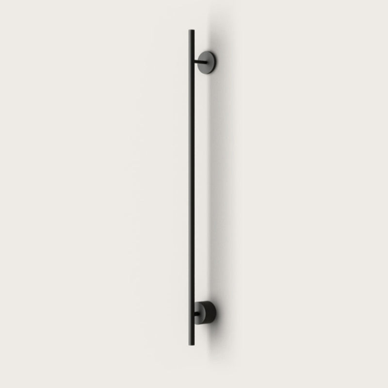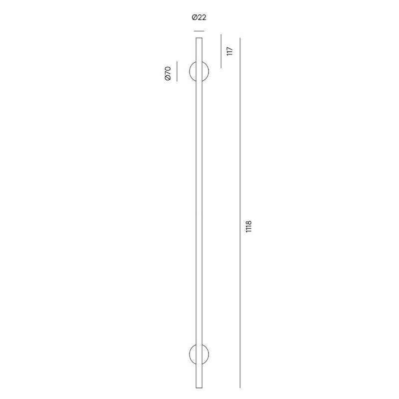 Clock Wall Light designed by Pepe Fornas for Aromas del Campo features an elongated and slimline steel rod with a solid cylindrical wall fixture. Clock Large Wall Light features an elongated and slimline steel rod with a cylindrical wall fixture at the base and a contrasting circular fixture at the top. Incorporating a dimmable LED strip, this most minimal of wall lights has a subtle yet striking aesthetic where simple shapes and forms become the focus.