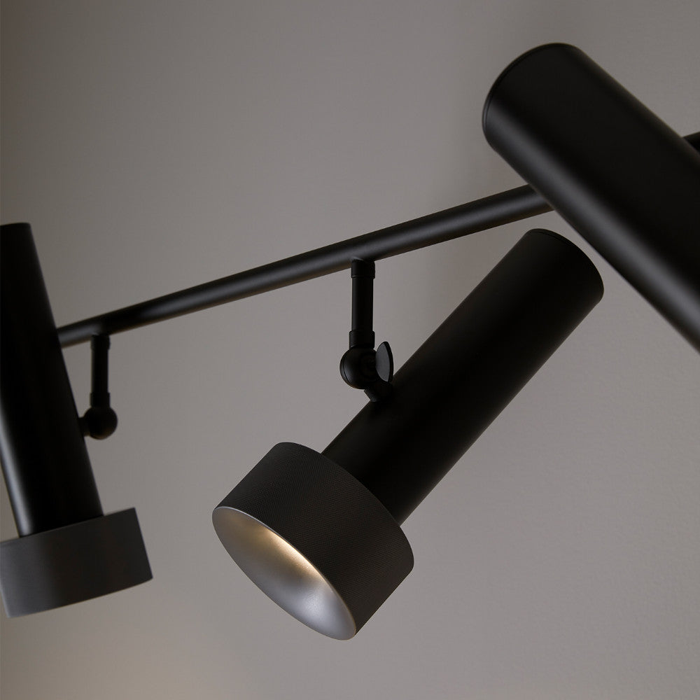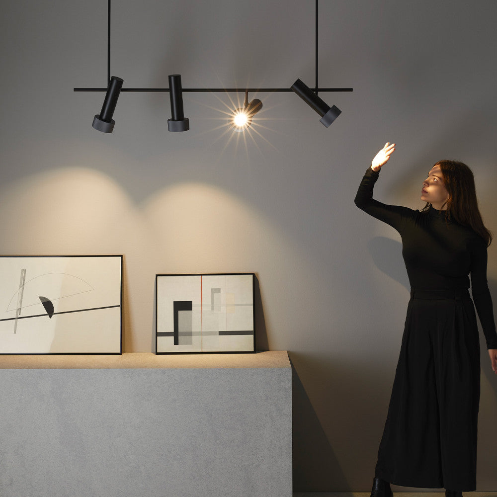 Focus Linear Pendant Light by Pepe Fornas for Aromas features a structure and spotlight finished in matte black, with the option to choose the head finish between aged gold, natural or anthracite. The Focus Linear collection is adjustable allowing light to be directed according to the needs of the moment.