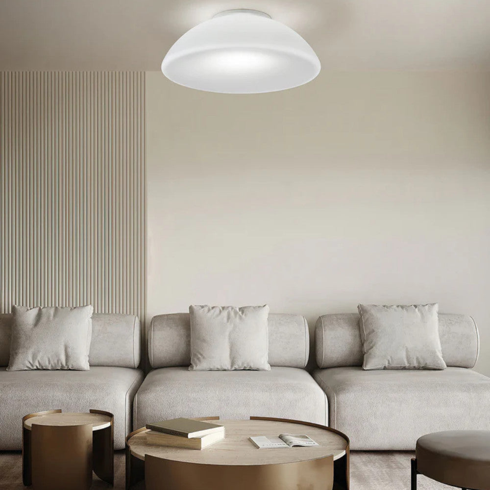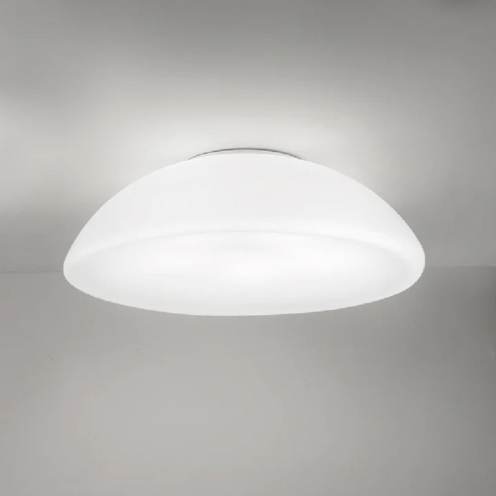 Infinita is an elegant collection of flush mount lights with mouth blown murano glass shades and metal bases. Infinita can be installed as ceiling or wall light. The shape of the satin glass diffuser evenly distributes light within a space. Available 3 sizes with satin white finish.