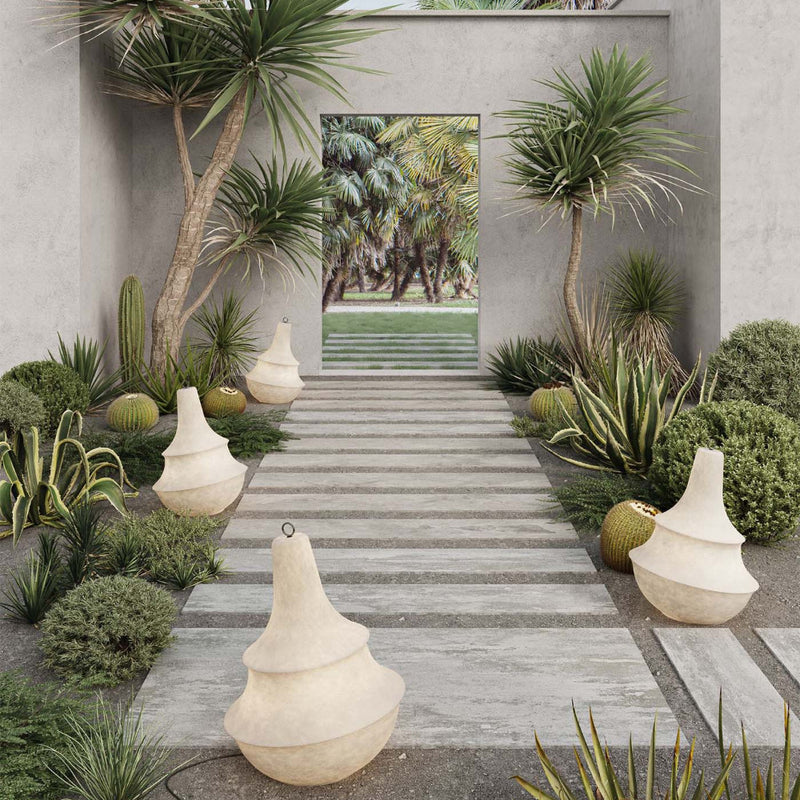 Lady D Outdoor Floor Lamp by Karman is from a collection that retains all the elegance and refinement of a crystal chandelier yet with a simpler form. A white fiberglass diffuser enhances the unique and intriguing silhouette of the Lady D collection. The floor lamp can be moved thanks to a ring on the top of the diffuser.