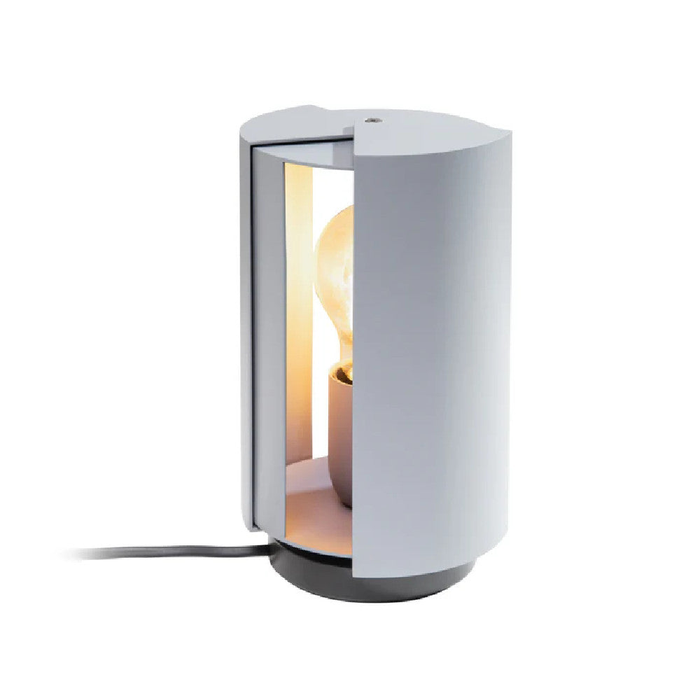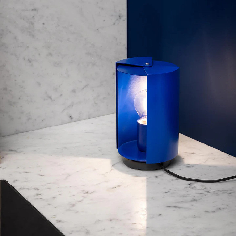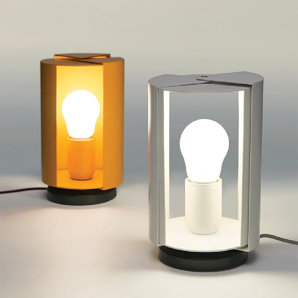 Innovative design for the 50s but still a contemporary table lamp. The lighting output is adjusted by the opening or closure of the volets. Its cylindrical body opens on two sides on which two diffusers rotate allowing the opening and closing of the light beam to adjust the light in a direct or indirect way. Steel base painted in matt grey, body in rolled metal sheet painted in a variety of finish options. Switch on cable.