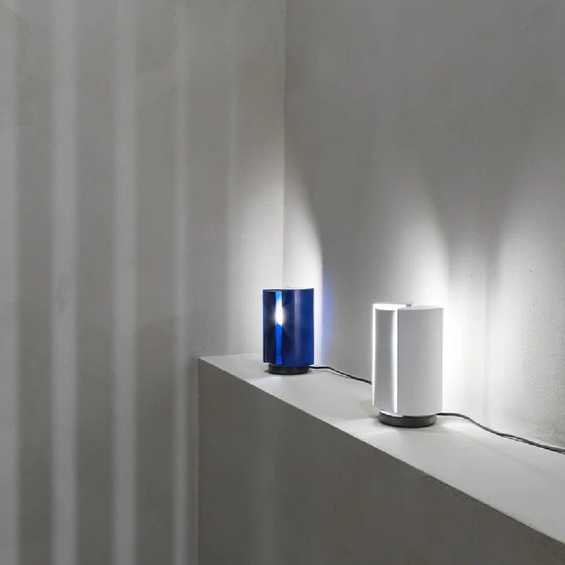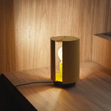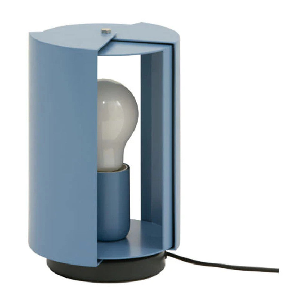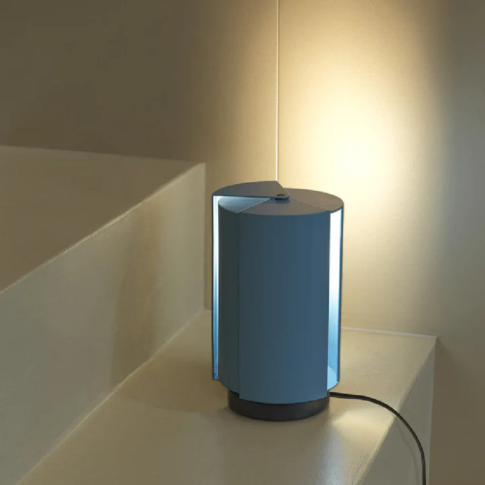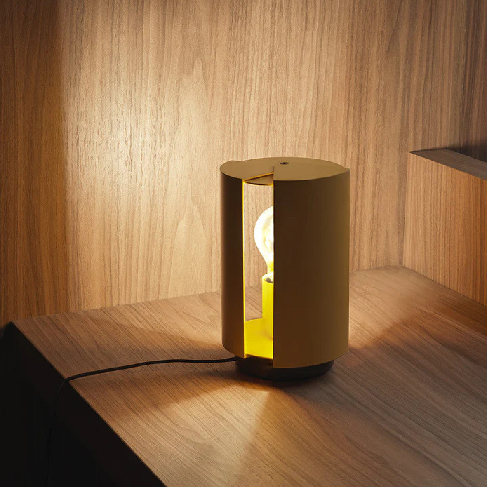 Innovative design for the 50s but still a contemporary table lamp. The lighting output is adjusted by the opening or closure of the volets. Its cylindrical body opens on two sides on which two diffusers rotate allowing the opening and closing of the light beam to adjust the light in a direct or indirect way. Steel base painted in matt grey, body in rolled metal sheet painted in a variety of finish options. Switch on cable.